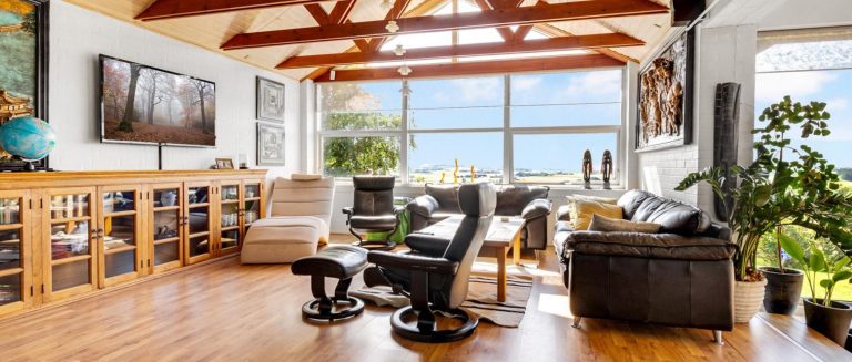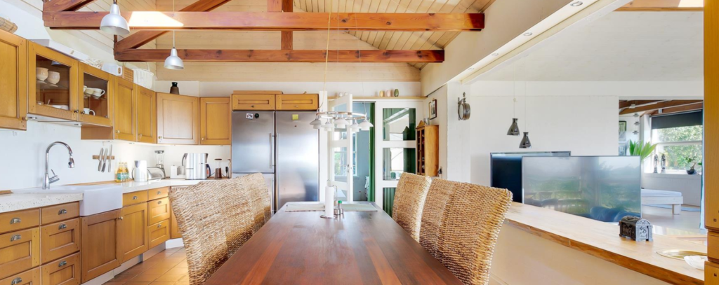 I hele huset er stilen en gennemgående harmoni af lyse toner og naturnuancer, som sammen med smukke detaljer som lofter til kip, synlige spær, store vinduespartier og blanke gulve danner rammen om et regulært hjem – og naturligvis er de praktiske rum som køkken, bryggers og badeværelser velindrettet og lige til at tage i brug.