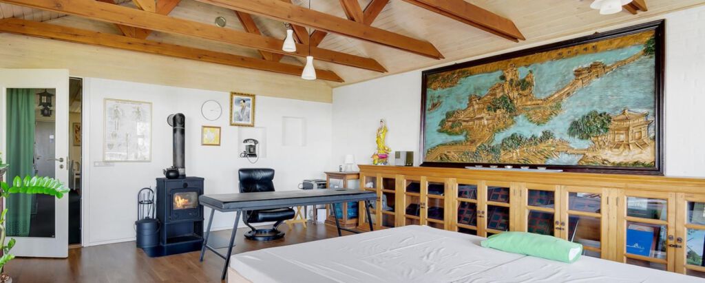 Selve boligen er noget af et spændende skatkammer. Det er tydeligt ved første øjekast, at det udover at være et hjem også har været benyttet som klinik, og måske sætter det de entreprenante tanker i gang, når I nu bevæger jer videre ind. Der er direkte adgang til selve klinikken fra udestuen, der er det perfekte venteværelse, så kunder kan komme direkte til briksen uden at skulle forvilde sig ind i boligen.