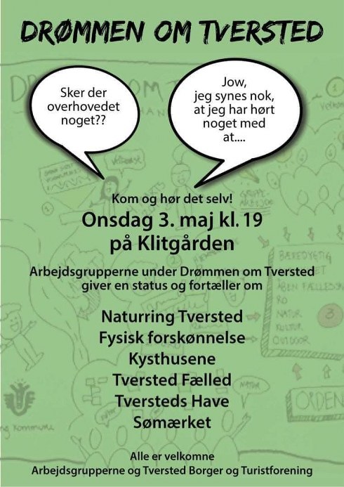 Det er arrangeret af arbejdsgrupperne under samarbejdet på tværs, Drømmen om Tversted, og Tversted Borger og Turistforening. De vil give en status og fortælle om de aktuelle projekter Naturring Tversted, Fysisk Forskønnelse, Kysthusene, Tversted Fælled, Tversteds Have og Sømærket.