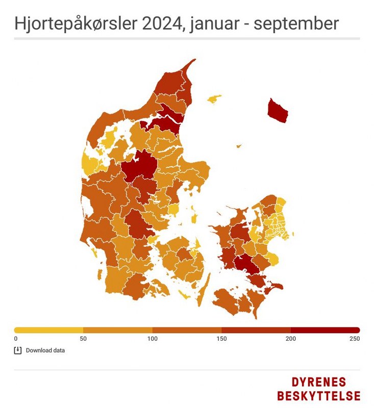 I alt har Dyrenes Beskyttelse rykket ud til 7529 hjortepåkørsler i de første ni måneder af 2024. Kigger vi på tallene for landets 98 kommuner, topper Aalborg med 272 påkørsler i årets første ni måneder, mens 4700 Næstved er det postnummer, der ligger højst med 115 påkørsler.