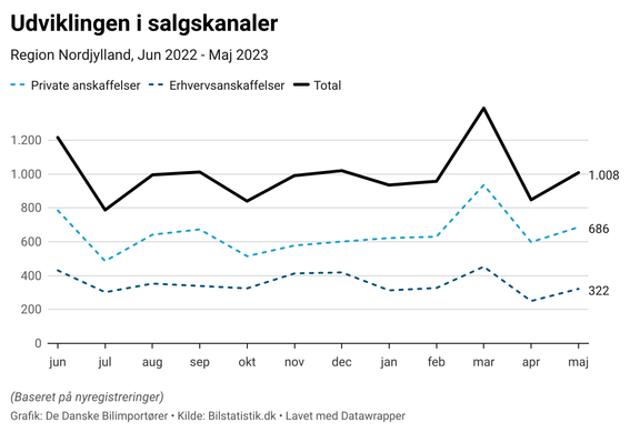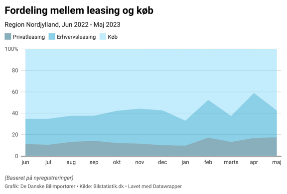 Leasingen har været stigende i Region Nordjylland over de seneste 5 måneder, hvor andelen af leasing er vokset med 9,4 procentpoint, når man sammenligner maj med januar. I maj udgjorde privatleasingen 17,6 procent mens erhvervsleasingen udgjorde 25 procent. Andelen af køb har været præget af udsving, men udgjorde i gennemsnit 55,1 procent af salget i årets første fem måneder. Køb var dermed generelt fortrukket i Nordjylland i 2023, og også i maj hvor køb udgjorde 57,4 procent af salget. Andelen af køb ser dog ud til at være faldende når man sammenligner med udgangen af januar måned.