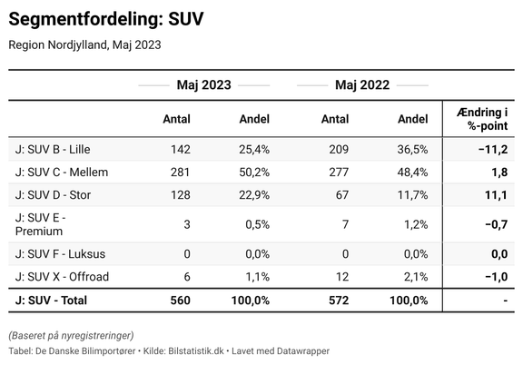 Overordnet var det SUV-segmentet der i Nordjylland tiltrak med opmærksomhed fra forbrugerne. 55 procent af de solgte biler i regionen var SUV’er.  Segmentet forholdt sig stabilt med en marginal nedgang på 0,03 procent.