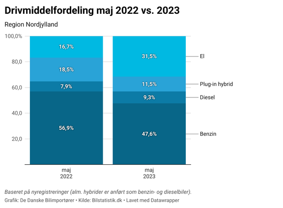 Benzin er fortsat det mest foretrukne drivmiddel på landsplan. Det er det også i Region Nordjylland, hvor 47,6 procent af salget i maj var benzinbiler. Markedsandelen for benzin var faldet med 9,3 procentpoint fra 56,9 procent i maj 2022. Det næstmest fortrukne drivmiddel var el. Elbiler stod for 31,5 procent af markedet i maj 2023 efter en fremgang på 14,8 procentpoint. Dermed er markedsandelen for elbiler blevet fordoblet i Region Nordjylland. Diesel gik en smule frem med 1,45 procentpoint, hvilket gav en markedsandel i maj 2023 på 9,66 procent. Plug-in hybridbilernes nedadgående salg ses også på deres markedsandel. Den faldt med næsten 7 procentpoint til 11,5 procent i maj 2023.