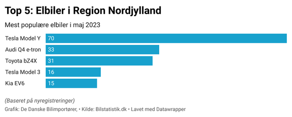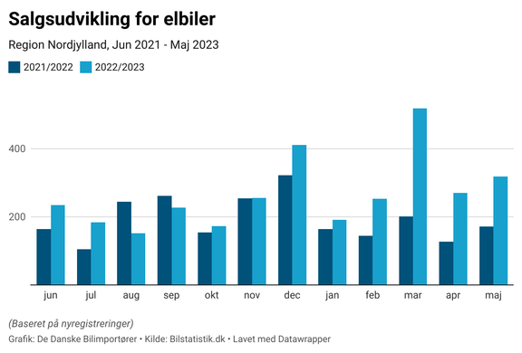 Der er betragtelige stigninger i elbilssalget i Nordjylland. I løbet af maj blev der indregistreret 318 nye elbiler. Det er en stigning på knap 85 procent i forhold til maj måned sidste år, hvor der blev indregistreret 172 elbiler.