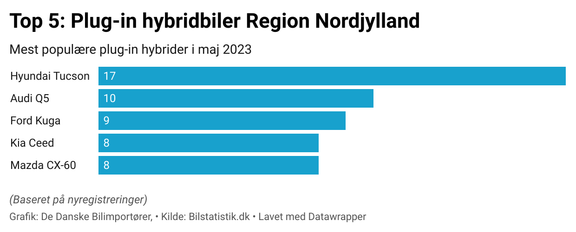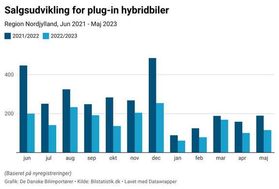 På nationalt plan er salget af plug-in hybridbiler nedadgående. Det er også et fænomen der sker i Region Nordjylland. Der blev indregistreret 116 plug-in hybrider i maj måned. Det var en reduktion på 74 biler i forhold til maj 2022. Procentuelt svarer dette til en reduktion på 38,9 procent. Der har over de seneste 12 måneder været tocifrede tilbagegange hver måned. Den faldende interesse for plug-in hybrider skyldes blandt andet, at tidligere favorable afgiftsfritagelser for plug-in hybriderne er under udfasning, hvilket påvirker salget negativt.