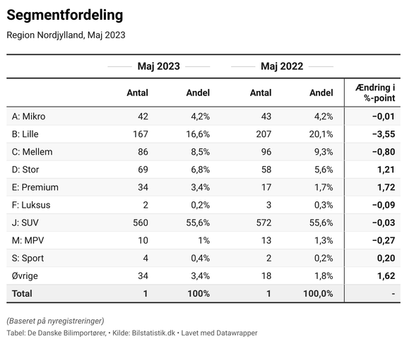 Der var mindre ændringer i segmentfordelingen i Region Nordjylland i maj. Den største ændring var en nedgang på 3,5 procentpoint til segmentet B: små biler. Segmenterne D, E og øvrige gik frem med henholdsvis 1,2 procentpoint, 1,6 procentpoint og 1,6 procentpoint.