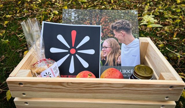 - En æblekasse fyldt med hjemmebagte småkager og hjemmelavet marmelade af æble og aroniabær – alt fremstillet med omtanke og omhu.