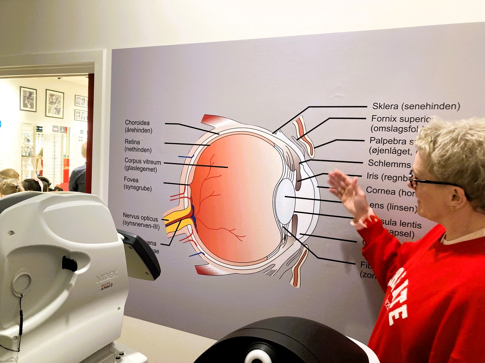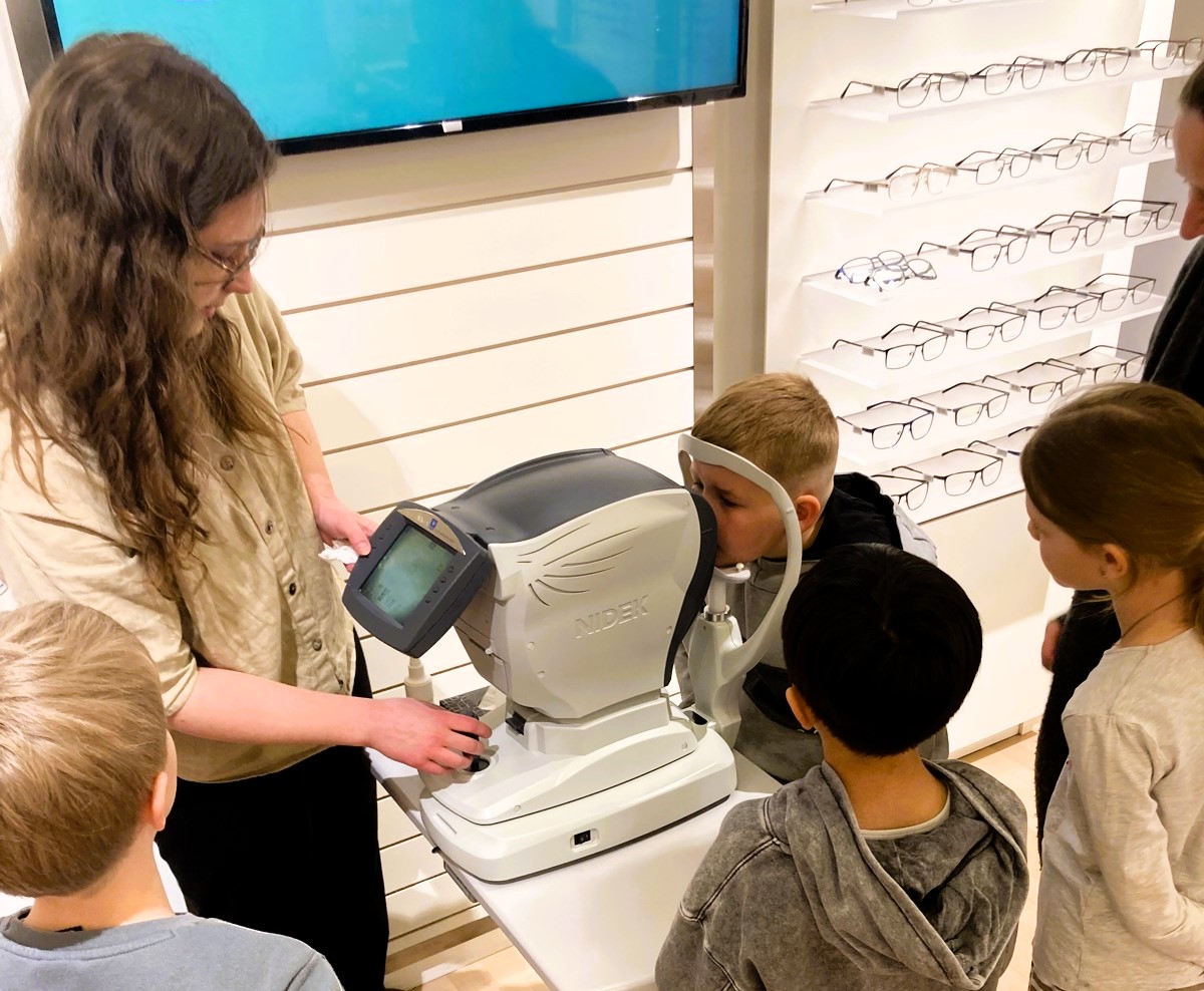 Tina og Line viste os rundt elever og lærer rundt på to hold. Her fik børnene prøvet forskellige typer af briller, snakket om nær- og langsynethed, målt øjne, set de maskiner, der laver synsprøver og fik briller på, der slørede deres syn.