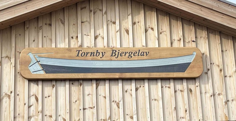 Lokale Allan Milton Woller, der har en skibsbyggeruddannelse i rygsækken, har gennem flere måneder arbejdet på et skilt med et nyt logo for Tornby Bjergelav. Det flotte skilt udført i egetræ vil fremover pryde gavlen på det nye bådhus.