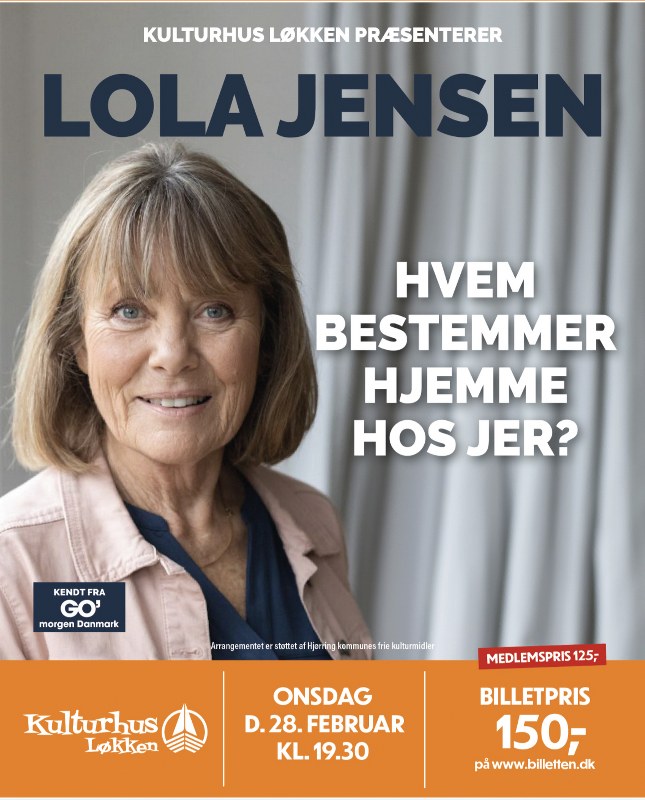 Familievejleder Lola Jensen kommer sidst i februar med foredraget ”Hvem bestemmer hjemme hos jer” Lola Jensen er kendt for at sætte familien Danmarks hverdag på humoristisk spids omkring familielivet og livet med børn. Lola er kendt for sine mange år som tilknyttet TV2.