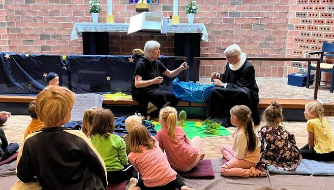 Diakonimedarbejder Bente Nedergaard Larsen og sognepræst Bjarne Hougaard er tydeligvis vilde med at lave Børnekirke.