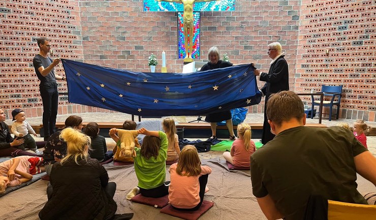 Man sidder på tæpper og stole helt forrest i kirken, så der er plads til både store og små.