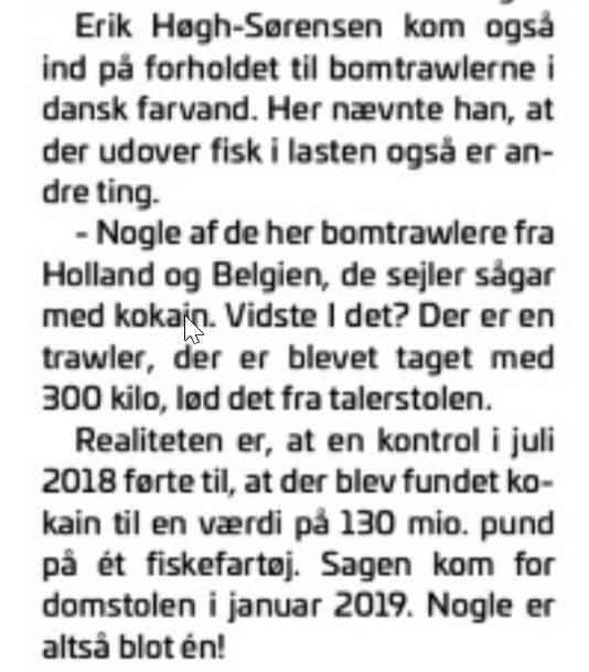 Dette er et udklip fra Fiskeritidende 16. marts 2019. Det er blot en af mange advarsler på baggrund af en hollandsk sag, hvor der blev smuglet 260 kg. kokain.