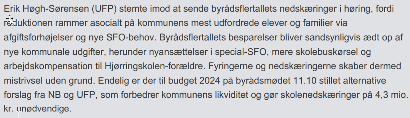 - Nye skatter og afgifter: Skoletidsnedsættelsen på Hjørringskolen medfører øget behov for special-SFO pasning, som forældrene skal betale.