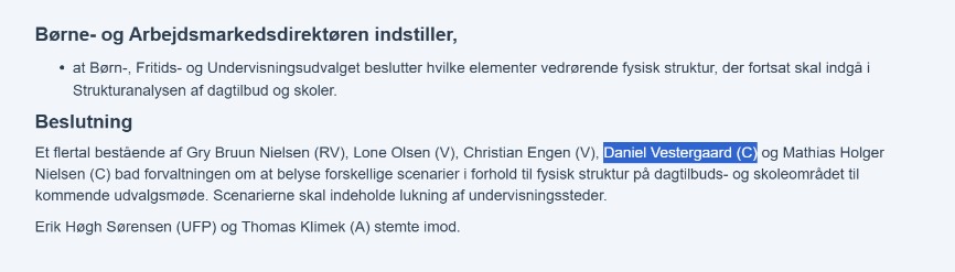 Særligt hos de konservative opleves en ganske styg partidisciplin under borgmesterkandidat Per Møller (K). Det ses af et mødereferat fra kommunens børne-, fritids-, og undervisningsudvalg (BFU) den 8. maj 2023, hvor de to konservative, Mathias Holger Nielsen og Daniel Vestergaard, støttede lukkesnakken. Vestergaard bor endda i Lendum.