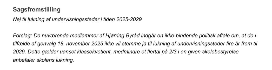 For at give vælgerne klare linjer foreslog Vendelbo-Listen på byrådsmødet 28. maj 2025 (punkt 10) en garanti mod skolelukninger i hele næste valgperiode. Det samme gjorde vi mht. plejehjem, herunder Lynggården i Hirtshals, på byrådsmødet 17. september (punkt 22).