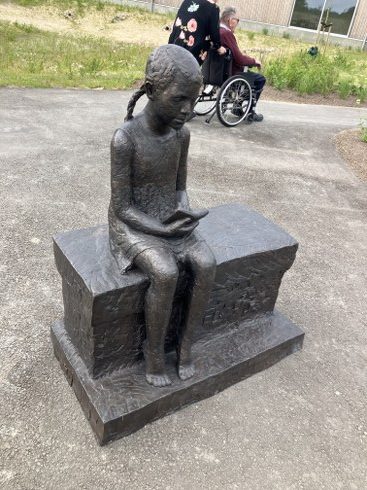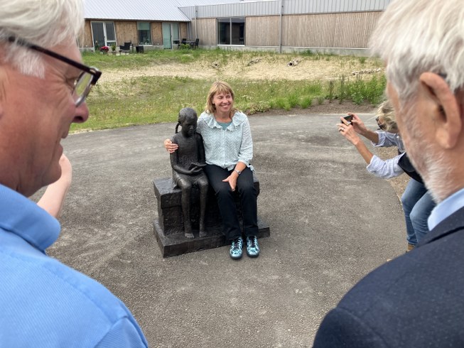 Formanden for udvalget, Troels Bistrup Hansen, fortalte i sin tale om skulpturen ”Emma på Bænken”, som nu forskønner uderummet i haven ved Centerbygningen.