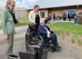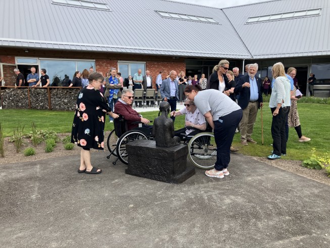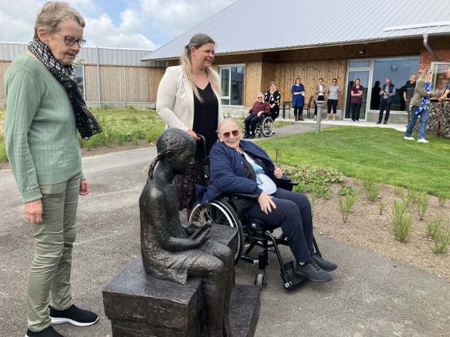 En af Soldalhus’ beboere, Ester Kristensen, fik æren at afsløre den flotte skulptur overvåget af de mange beboere og gæster og ikke mindst kunstneres datter, Karen Margrethe Varming.