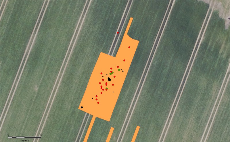 Figur af udgravningsfeltet med markering af fundstedet for alle mønterne. Figur: Vendsyssel Historiske Museum.