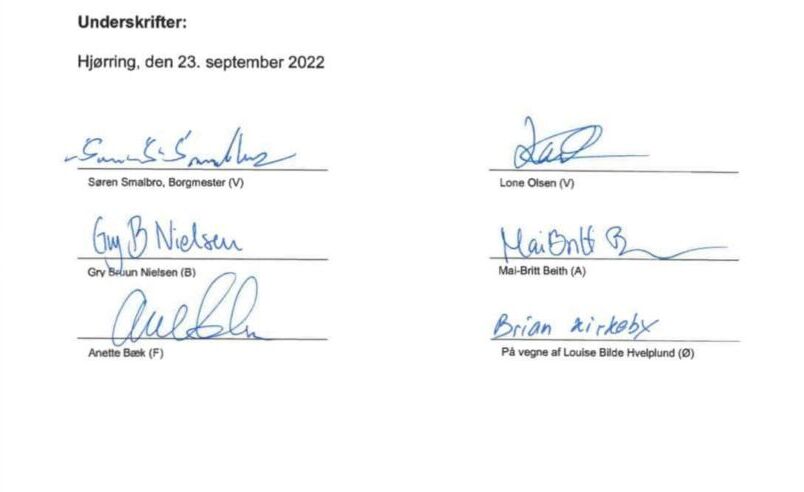 Efter lang tids hårdt arbejde og intense forhandlinger blev Hjørring Kommunes budget for 2023 i dag underskrevet af repræsentanter for de fem forligspartier Venstre, Socialdemokratiet, Radikale Venstre, Socialistisk Folkeparti og Enhedslisten. Udover budgettet for det kommende år, indeholder forliget også et budgetoverslag for årene 2024-2026.