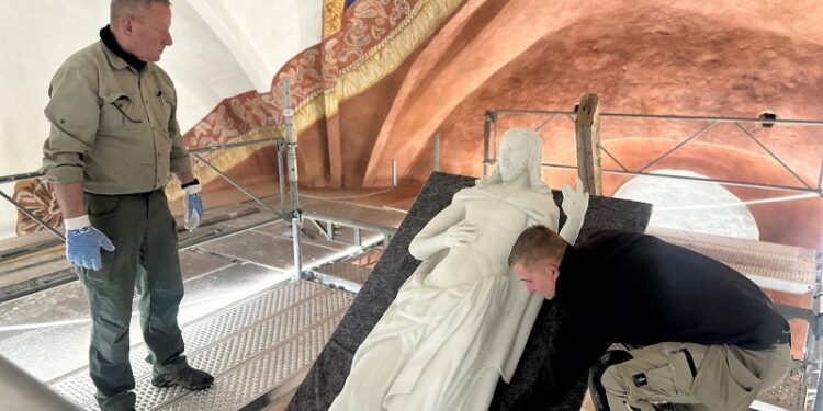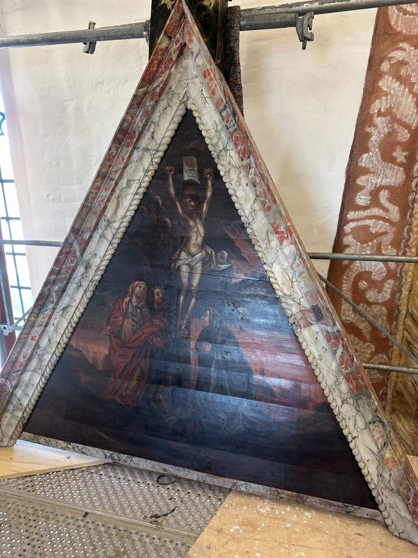 Dele af altertavlen er nu på vej tilbage i den gamle domkirke ved Børglum Kloster. Den smukke, restaurerede Jesus-figur er vendt tilbage til sin plads øverst på den imponerende 12 meter høje altertavle.