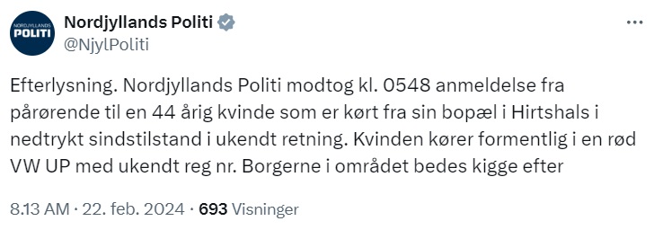 Det oplyste Nordjyllands Politi ifølge Presse-fotos.dk på det sociale medie X.