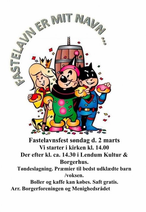 Årets fastelavnsfest i Lendum holdes søndag den 2. marts klokken 14 i kirken og derefter cirka klokken 14.30 i Lendum Kultur- og Borgerhus med tøndeslagning med præmier til bedst udklædte børn og voksne. Boller og kaffe kan købes.