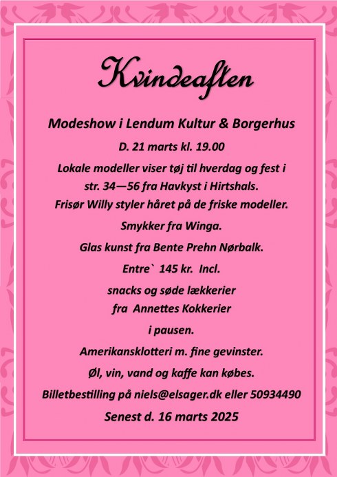 Den 21. marts er der i Lendum Kultur og Borgerhus kvindeaften med modeshow. Tilmelding til Niels på mailen niels@elsager eller telefon 50934490.