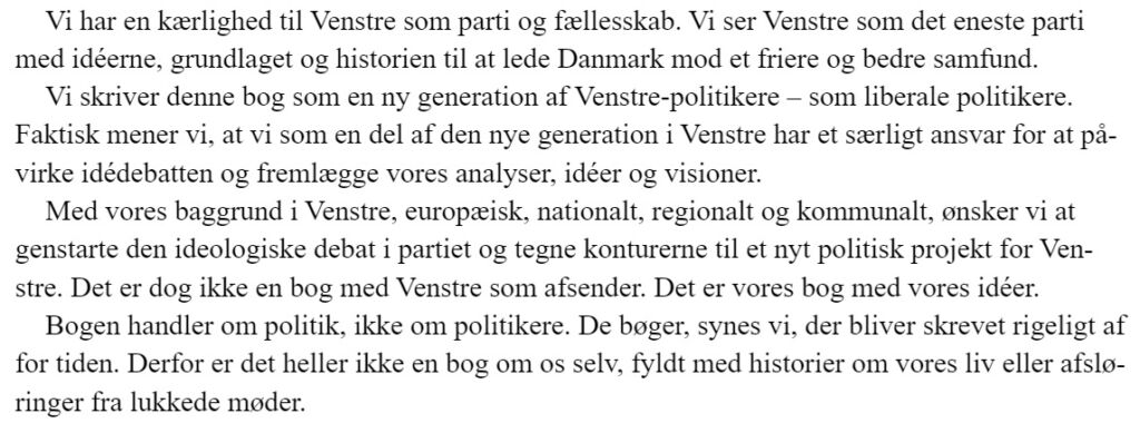 Tirsdag gælder det så fem unge Venstrefolk, altså nogle af dem, der sandsynligvis kommer til at tegne fremtidens gamle liberale parti, som i bogform præsenterer deres bud på et borgerligt og liberalt samfund i udgivelsen Må jeg være fri. Her tager de ifølge forlaget et opgør med fortidens politik – både de socialdemokratiske og de borgerlige regeringer – og fortæller, hvor det efter deres mening er gået galt. De problemer, som vores land står overfor, bliver ofte besvaret med mere stat, flere regler, mere indgriben.
