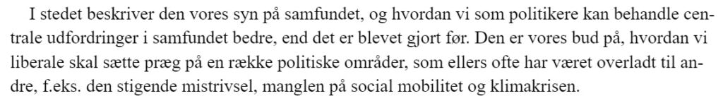 For hvert af disse områder præsenterer de status på området og giver deres bud på visioner og konkrete løsninger. Samlet danner disse svar en moderne borgerlig-liberal statskritik og et bud på en fremtid for Danmark.