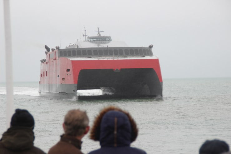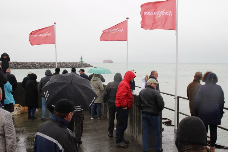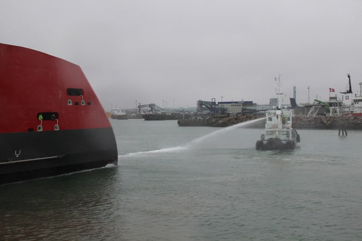 Der var derfor også mange lokale og gæster udenbys fra, der havde trodset det kolde vejr og regnen for at tage opstilling både på Leret og langs Vestmolevej samt selvfølgelig ude på molehovedet, da Fjord FSTR næsten præcis klokken 13 denne søndag anløb Hirtshals Havn, hvor katamaranfærgen også med behørig ærbødighed blev modtaget af både redningsfartøjet Margrethe Gaardbo og slæbebåden Tybring.