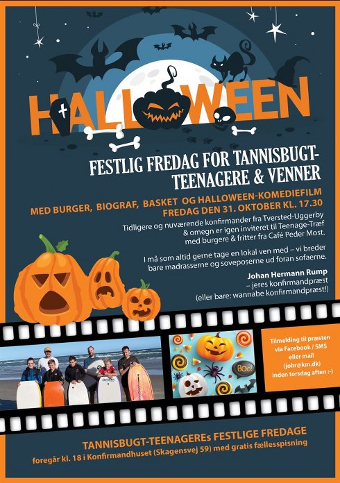 Der dækkes flot op med sort Halloween-dug, lys, servietter og fredagsslik. Det varer fra klokken 17:30-21:00 og er for cirka 6. klasse og op.