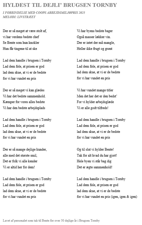 En af Brugsens populære medarbejdere Mikkel Kjær takkede sin chef for det fantastisk miljø og den gode stemning, der altid hersker i Brugsen, og han havde til lejligheden skrevet en sang ”Hyldest til Dejli’brugsen i Tornby”, der afsunget af de mange fremmødte.