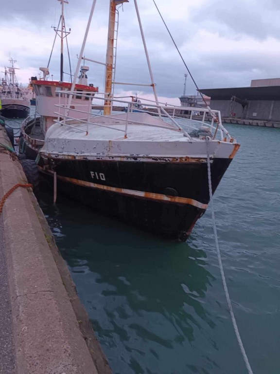 Det uheldsramte fartøj Fio, der tidligere har været sunket ved kajkanten, tager tirsdag morgen igen vand ind i Hirtshals Havn.