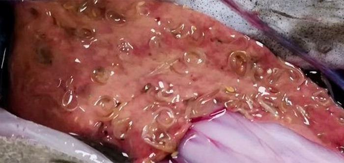 Jan Werner Thomsen har lagt ovenstående fotoserie ud på Facebook. Ligesom han har lagt nedenstående foto ud af indmad fra fisk, der angiveligt er fyldt med sælorm.