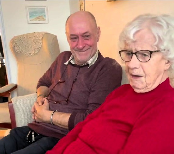 Niller i godt selskab med skribentens svigermor ved en tidligere lejlighed, hvor hun synger for dagens fødselar. Niller blev ved med at komme med smurte rundstykker til hende hver søndag morgen. Selv da min svigermor kom på plejehjem. Screenshot: Niels Chr. Jakobsen.