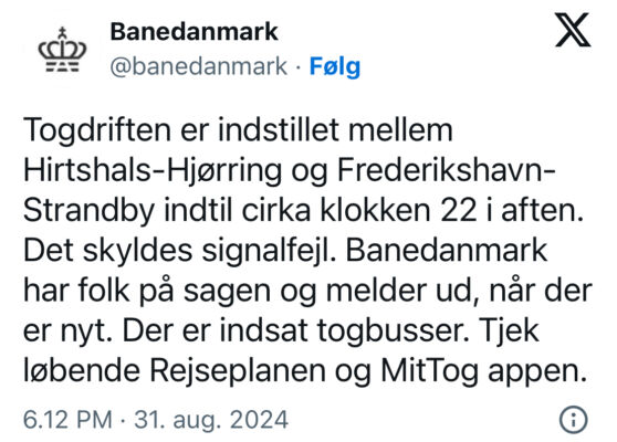 På grund af signalfejl hos Banedanmark er der nu igen problemer for rejsende i Vendsyssel.