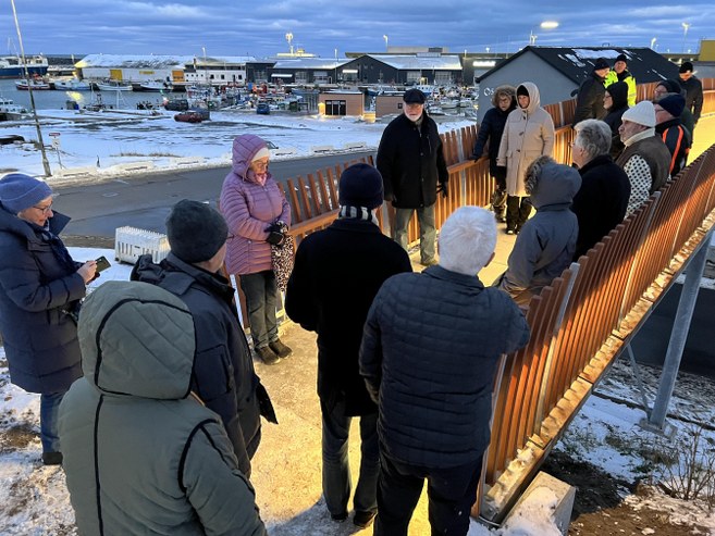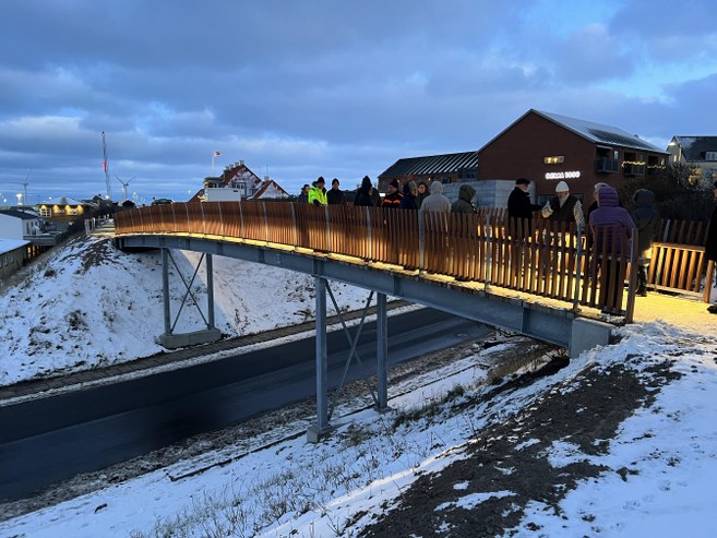 Fredag eftermiddag var der om ikke officiel indvielse, som først finder sted til foråret, så dog en lille ceremoni i anledning af første aften med lyssætning på og åbning af den nye gangbro over Skagerrakvej.
