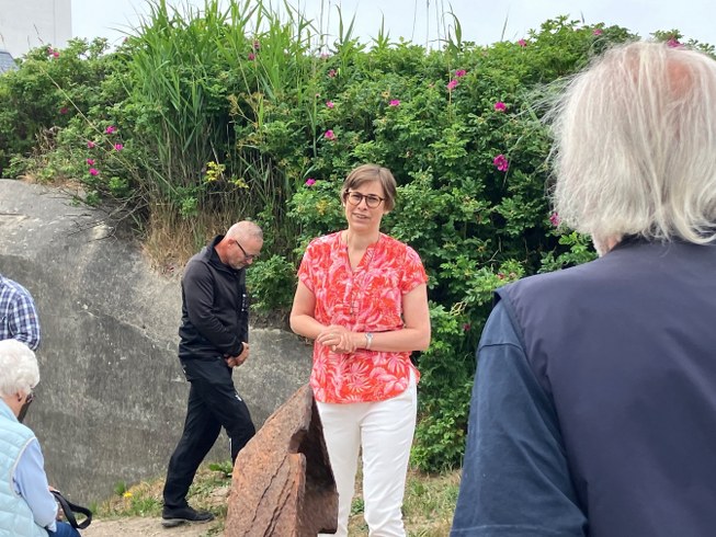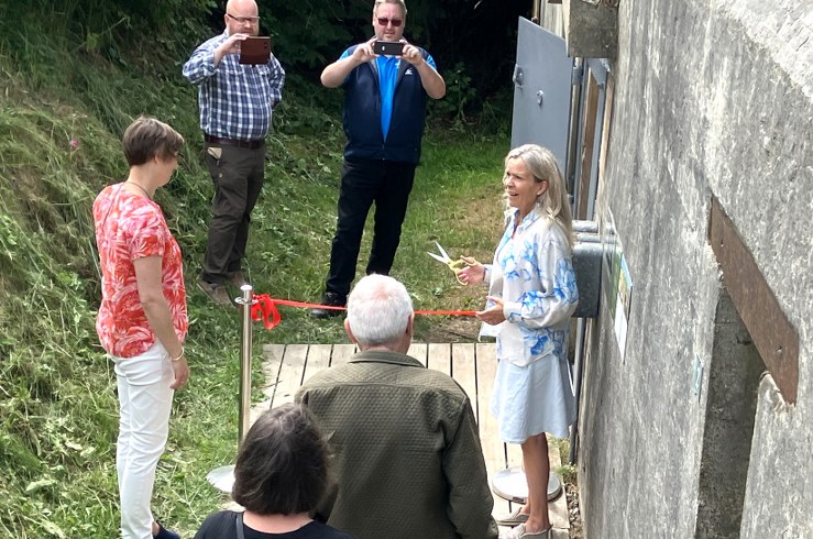 Turistchef Laila Zielke leverede åbningstalen og fik æren af med guldsaksen at klippe den røde snor til den officielle genåbning af bunkeren.
