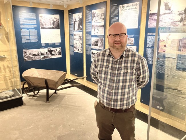 Jens-Christian Hansen, formidlingschef hos Vendsyssel Historiske Museum, fortalte om de første 30 år af bunkermuseets udstillinger og arbejdet med den nye udstilling. Foto: Palle W. Nielsen