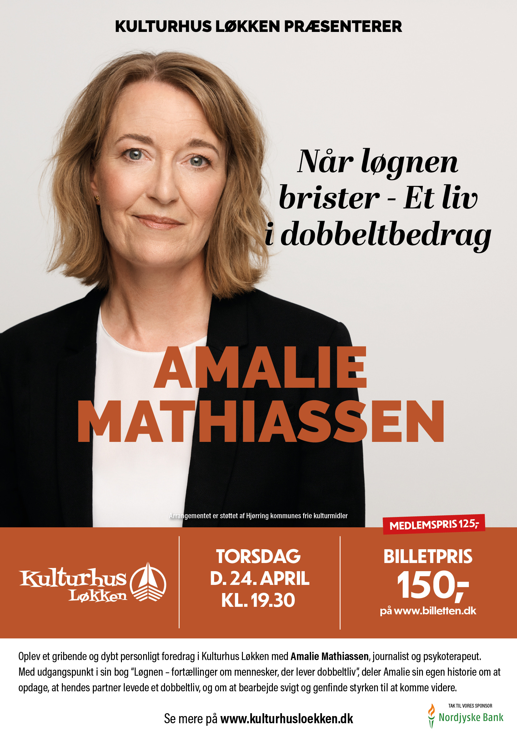Kulturhus Løkken inviterer til en gribende og tankevækkende aften med journalist og psykoterapeut Amalie Mathiassen. Med udgangspunkt i sin bog Løgnen – Fortællinger om mennesker, der lever dobbeltliv (2024) deler Amalie sin personlige historie om svigt, bedrag og vejen til heling.