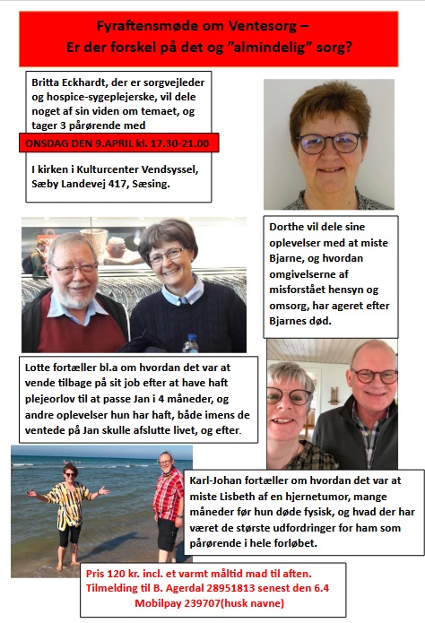 Britta vejleder pårørende der er i ventesorg og patienter der er ramt af sygdom, og den sorg det fører med sig. Hun kommer i netværkscafeen onsdag den 9.4 til et fyraftensmøde og giver os et indblik i hvordan man kan forstå begrebet. Er der forskel på ventesorg og sorg efter et dødsfald ? Hun har 3 pårørende med som alle har mistet deres ægtefælle, og fortæller om hvordan de har haft det i tiden inden dødsfaldet, tiden under og efter, og hvordan de har oplevet omgivelsernes reaktion bagefter.