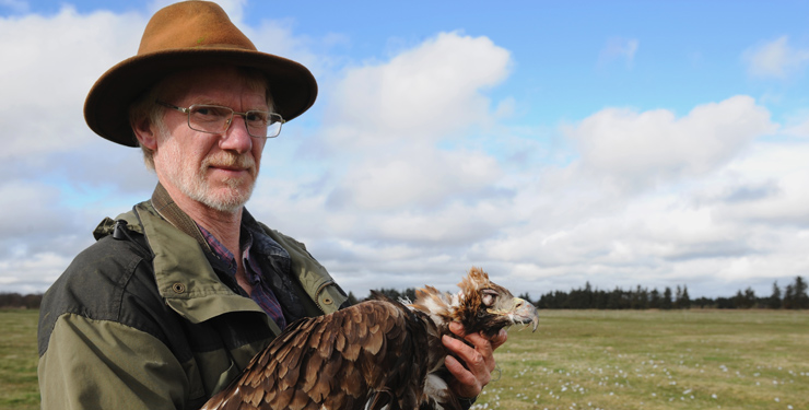 I dag tæller og undersøger han også alle rederne af rød glente, kongeørn og stor hornugle i Nordjylland. På billederne ses Jan Tøttrup Nielsen med dræbt kongeørn i Store Vildmose i 2016.