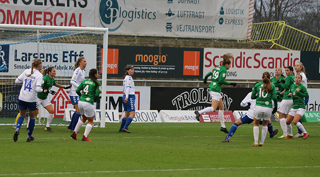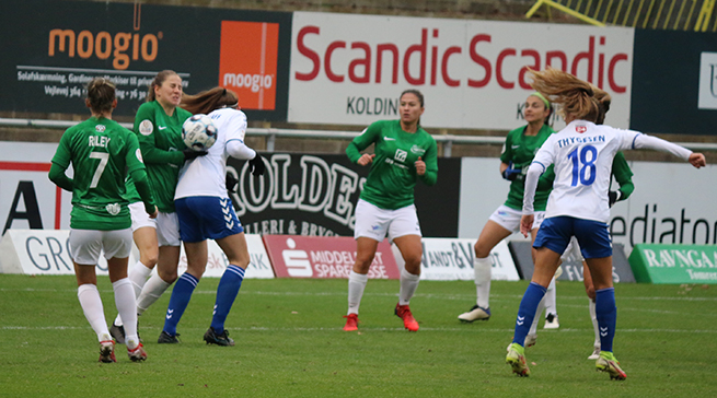 Hvad angår søndagens kamp i Kolding oplevede man et Fortuna-hold, der kæmpede for sejr og points. L energi blev lagt i og det var da også et vilje-og energimål, der satte Fortuna i gang. Forsvarsspilleren Janelle Cordia kæmpede sig i det 32. minut hele vejen igennem og sendte bolden ind bag Koldings landsholdsmålmand Lene Christensen.