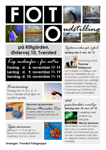 Fra fredag den 8. november til søndag den 10. november kan besøgende opleve en bred vifte af fotografiske værker skabt af Tversted Fotogruppes medlemmer. Udstillingen finder sted på Klitgården og er åben fredag fra klokken 17 til 19, lørdag fra 11 til 19 og søndag fra 11 til 15.