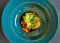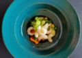Sidst i fotoserien her – og jeg må indrømme, at portrættering af serveringsklar mad er et følsomt emne, som man kan blive bedre til… også… skålenes rigtige farve ligger tættere på de udendørs optagelser – et bud på, hvordan torsk, grønt, grønlandske rejer og karrysuppe ikke bare bliver spiseligt, men også gør sig visuelt…