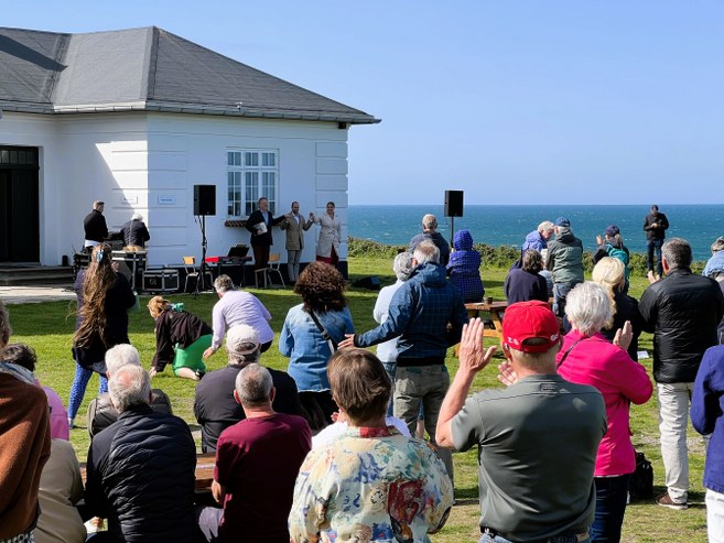 Lørdag til middag blev den lokale to dages festival med opera sunget i gang med frisk vind og solskin nord for det omhyggeligt stilladserede og pænt indpakkede Hirtshals Fyr.