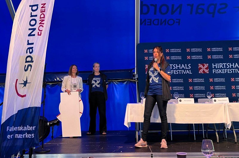 Maja Vestergaard Olesen var tilstede for med gode argumenter at motivere overrækkelsen af to store checks fra henholdsvis Hirtshals Sparekasses Gavefond og Spar Nord Fonden, der blandt andet har muliggjort købet af det nye telt Bølgen til Hirtshals Fiskefestival, som tidligere på året med succes blev indviet først af Naturmødet og dernæst Musik Under Trappen.