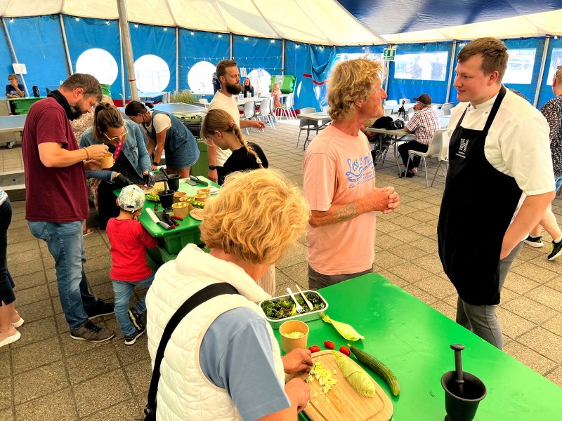 Mens starten gik og talerne blev holdt i teltet på Sydvestkajen, var der også allerede gang i de spændende og lærerige madværksted for familier i teltet Skibet på Den Grønne Plads. Lokale Thorsten Laursen er i skrivende stund i gang med madlavningen i selskab med en tysk familie, der igennem adskillige år har besøgt ham som venner i privaten på Nejstbrinken i Hirtshals.