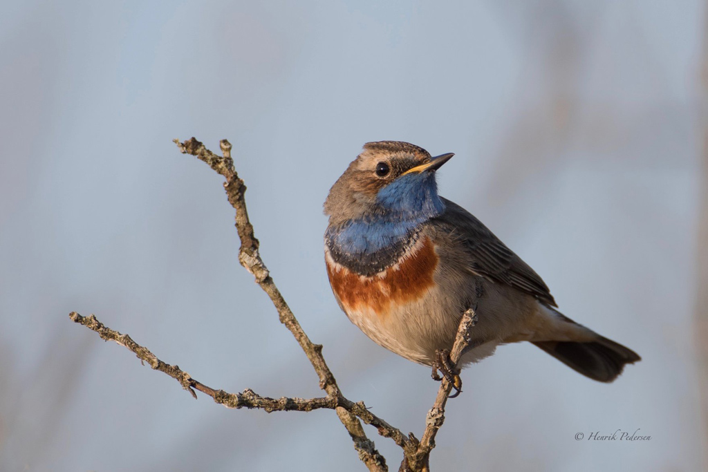 Blandt ynglefuglene fik sydlig blåhals særlig opmærksomhed. Efter at denne race af arten blåhals de senere år har bredt sig op gennem Jylland, har Anders Østerby besøgte en lang række egnede ynglesteder i kommunen for at se, hvor udbredt racen er blevet i NV-Vendsyssel. Flere fuglekiggere deltog i eftersøgningen, og det blev i alt til en halv snes sandsynlige og mulige ynglefund, så vi nu kan konstatere, at den er en etableret ynglefugl i Hjørring Kommune. Blåhals-hannen her er fotograferet af Henrik Pedersen.